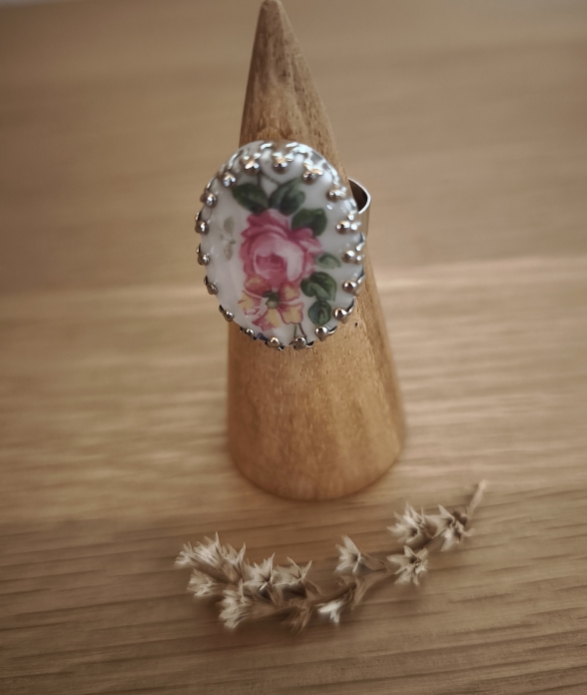 Bague réglable qui convient à toutes les tailles avec un cabochon ovale en porcelaine 13x18mm taillé dans une assiette ancienne.