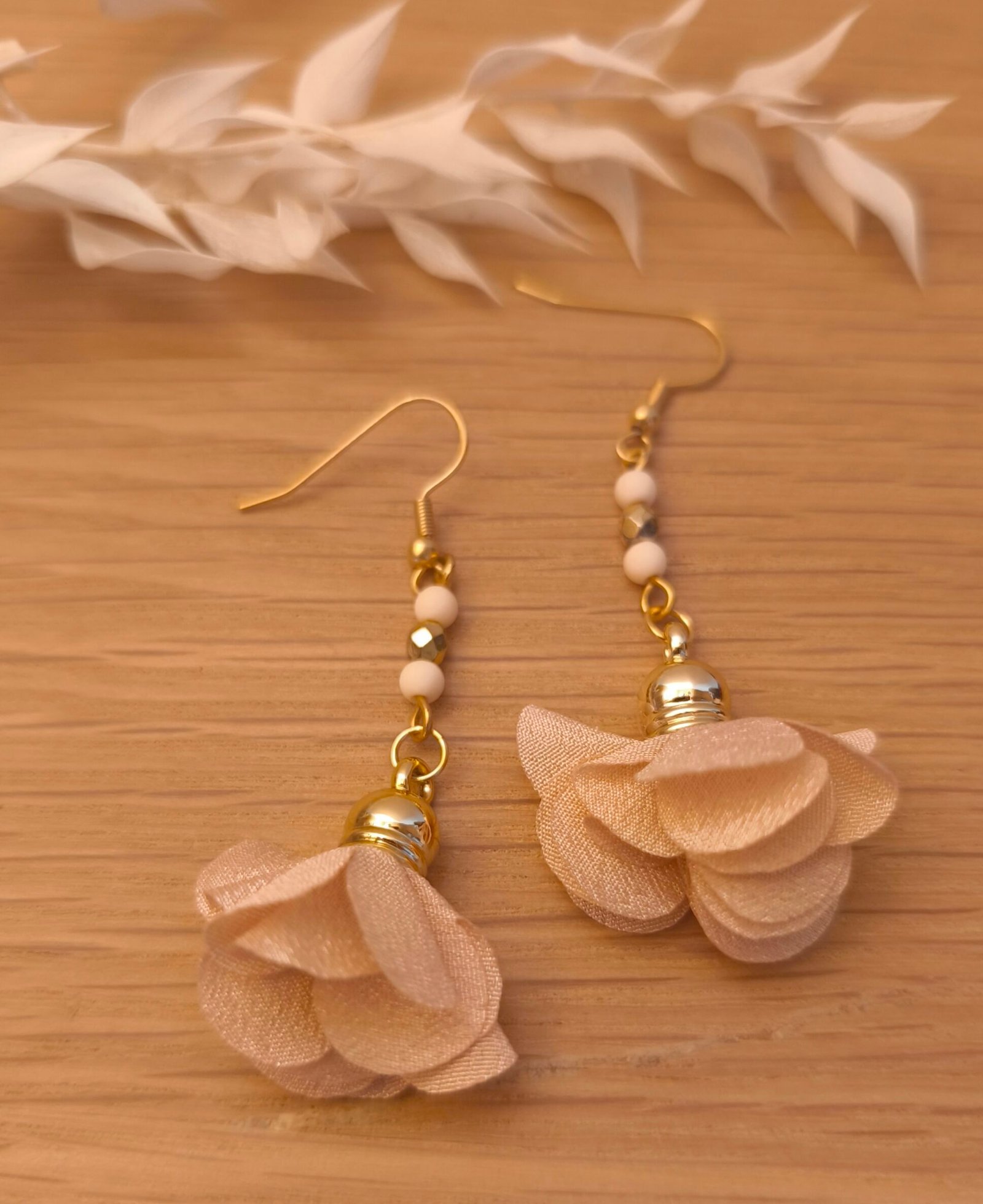 Chaque détail de ces boucles doré et beige est soigneusement conçu pour s’adapter à toutes les occasions. Le pompon en tissu de soie ajoute une touche bohème tout en restant chic, contrastant harmonieusement avec une base métallique dorée éclatante. Leur légèreté en fait un accessoire confortable à porter, même pendant de longues heures, sans sacrifier leur esthétique luxueuse.