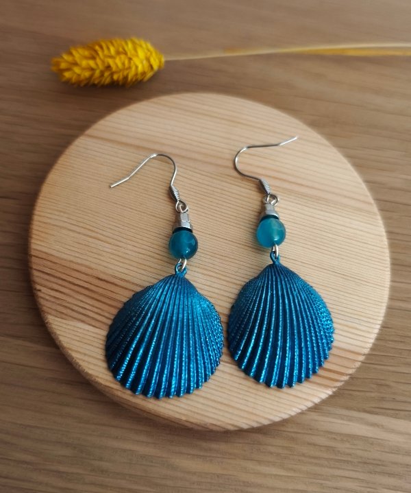 Ces boucles d’oreilles sont conçues avec des crochets en acier inoxydable dorés, garantissant durabilité et résistance à la corrosion. Les coquillages peints sont complétés par des perles d’agate bleues, connues pour leur beauté naturelle et leurs nuances captivantes. Cet équilibre entre les détails dorés et les pierres aux tons froids en fait une pièce parfaite pour les occasions spéciales ou le quotidien.
