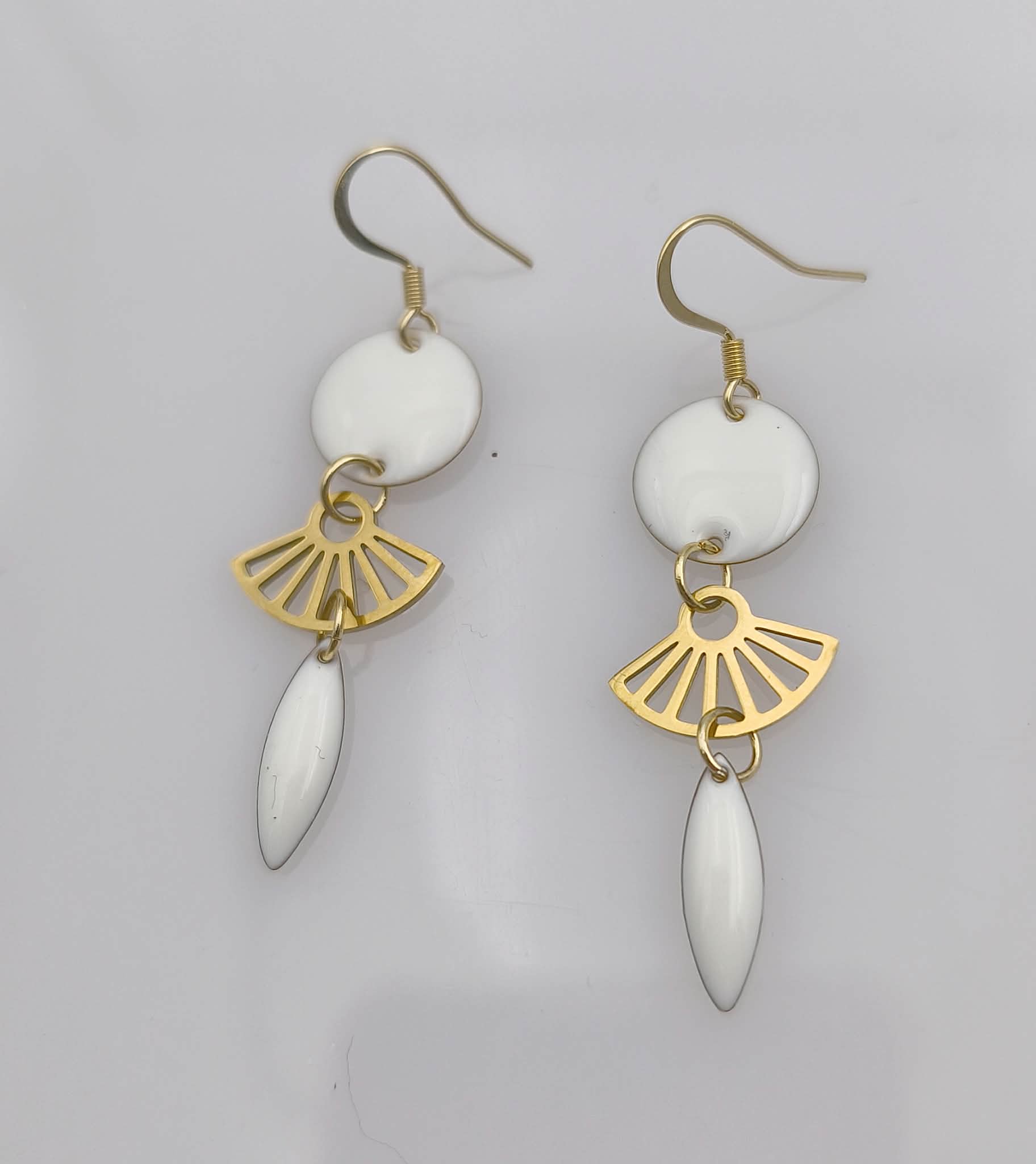 Les boucles Candice sont composées de breloques éventail en acier inoxydable doré  15 mm x 10 mm) et de deux sequins effet émaillé en forme de pastille et de navette de couleur blanc