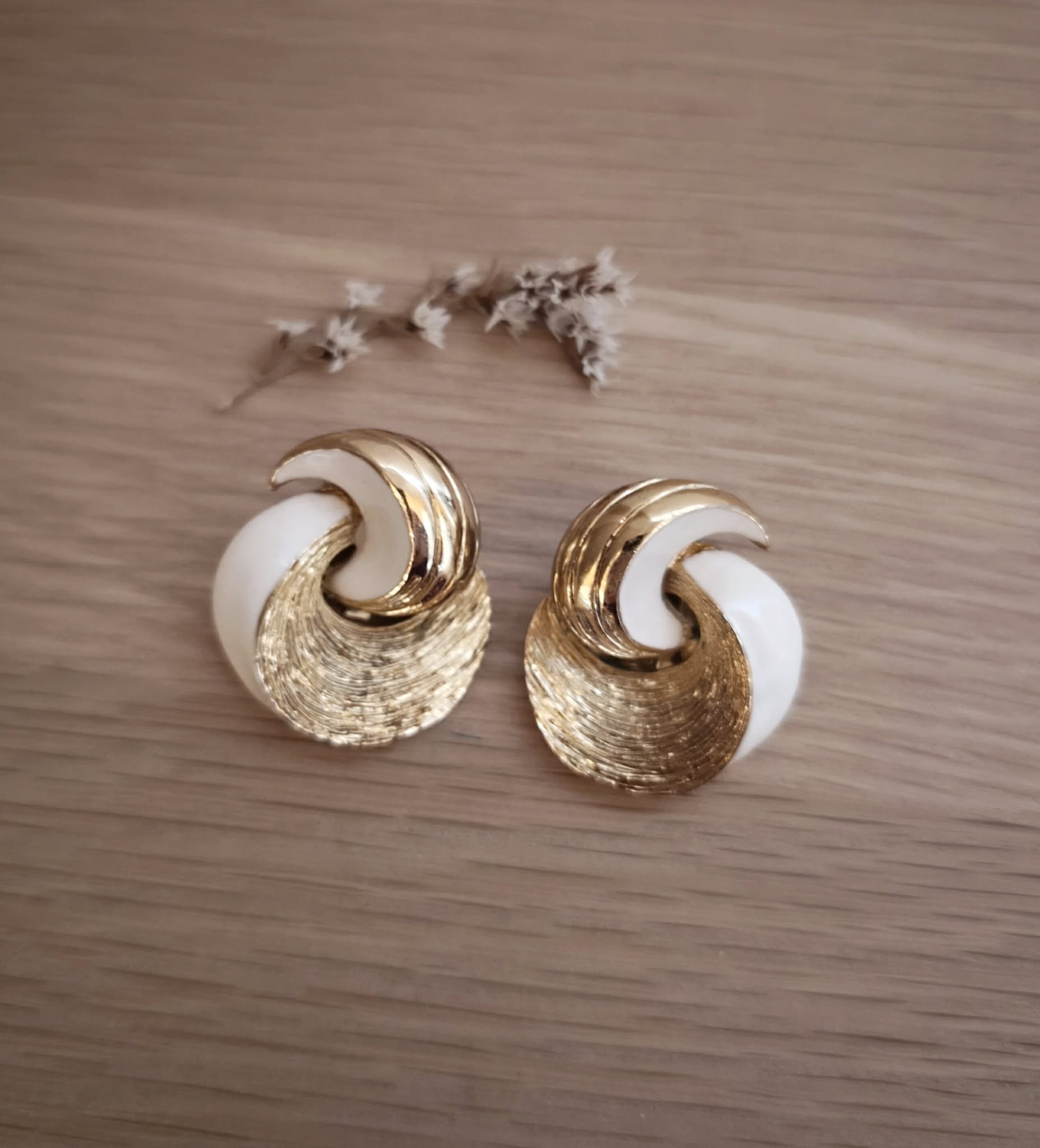 De forme arrondies avec un dessin de lames de coquillage dorées entrelacées avec une partie blanc nacrée, elles sont superbement belles de qualité.