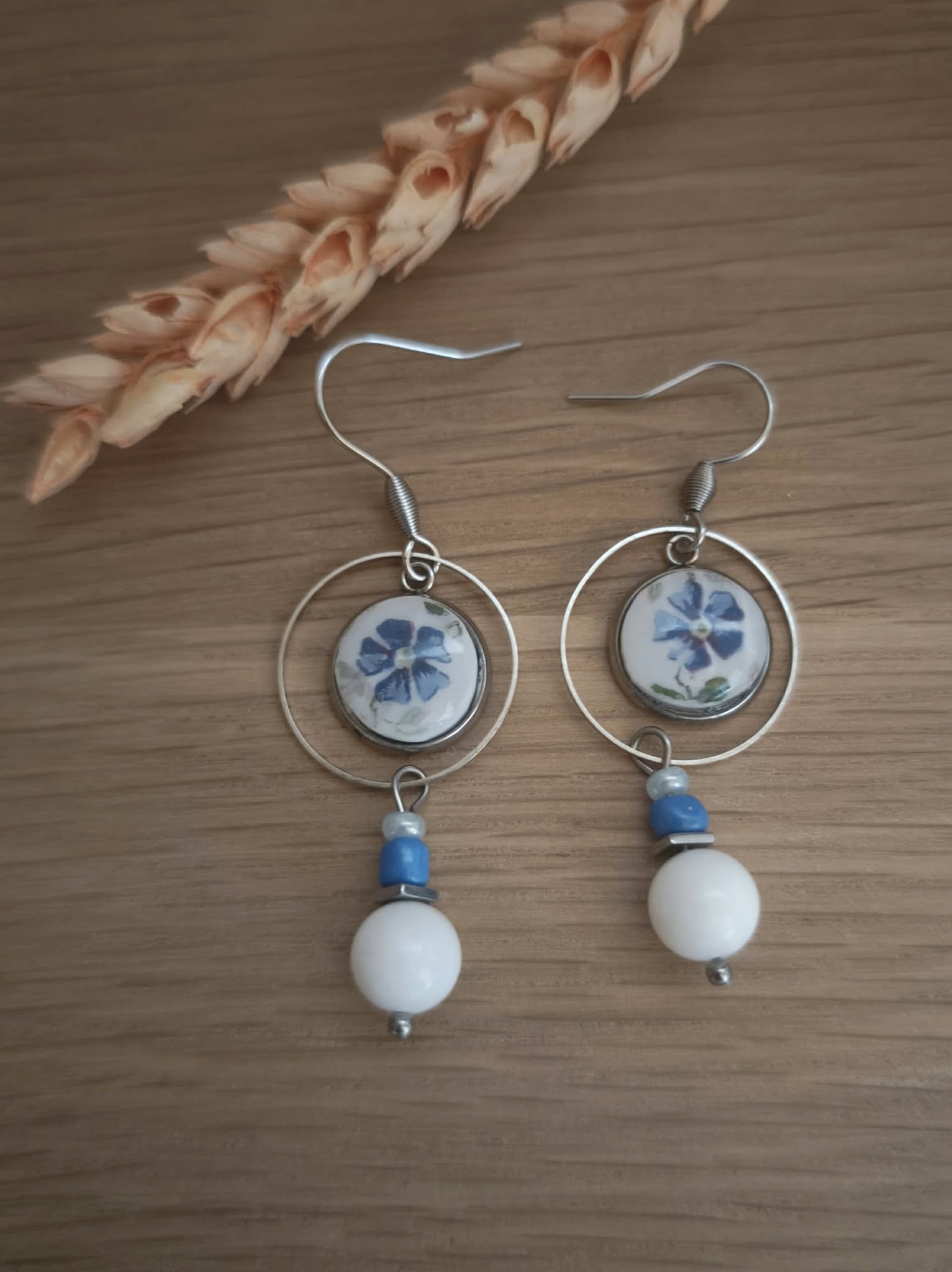 Les boucles Eve vous raviront par leur charme et leur gaieté. Elles sont composées de médaillons en porcelaine ancienne crées dans mon atelier fixés dans un cercle en métal avec des breloques en perles de rocailles en verre et des perles blanches de coquillage.