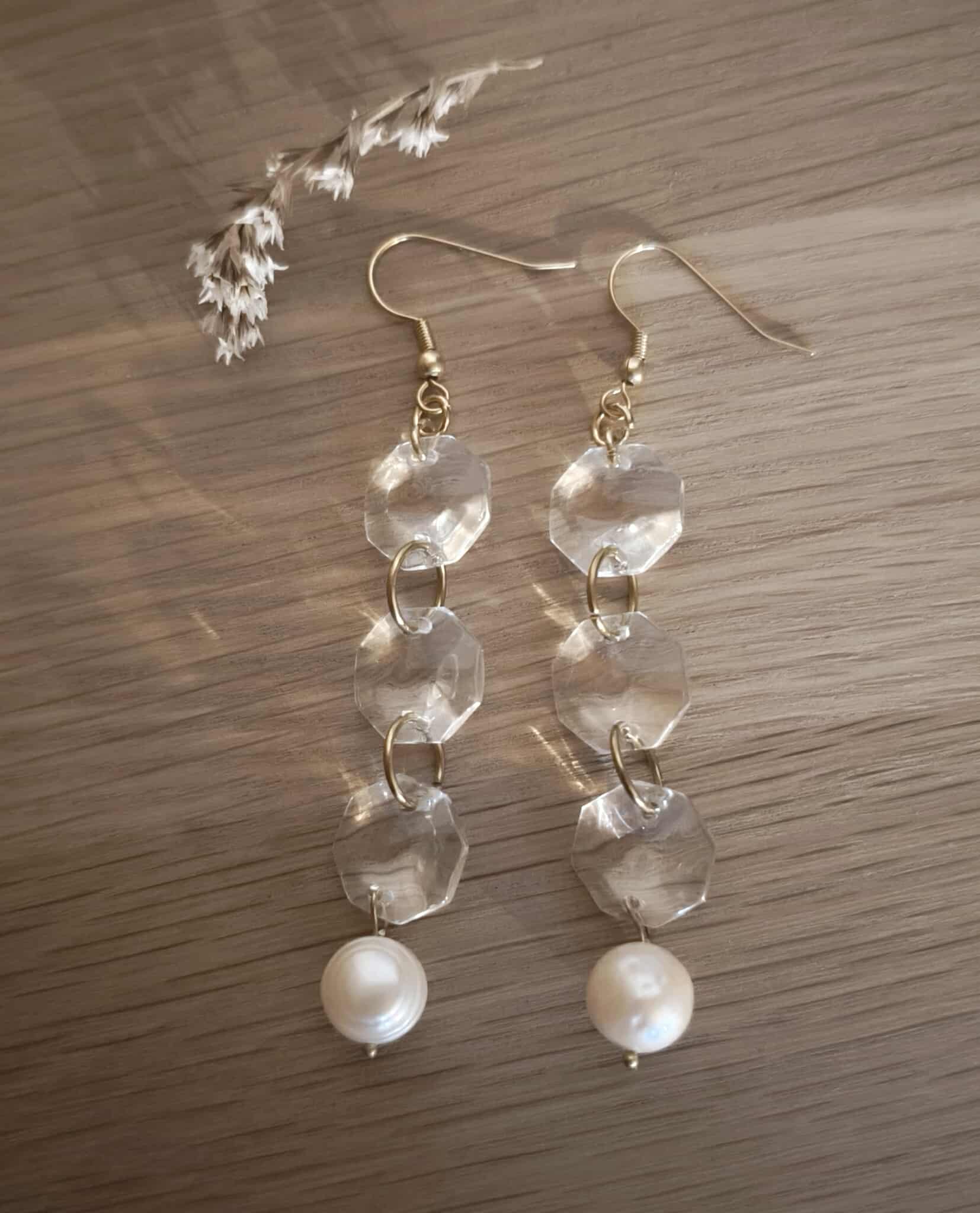 Ces boucles Grâce qui auraient pu facilement être porter par les plus belles actrices des années 50 sont composées d’hexagones en verre et de perles d’eau douces blanc nacré. Les crochets sont en acier inoxydable doré. Leur longueur est de 6,5 cm.
