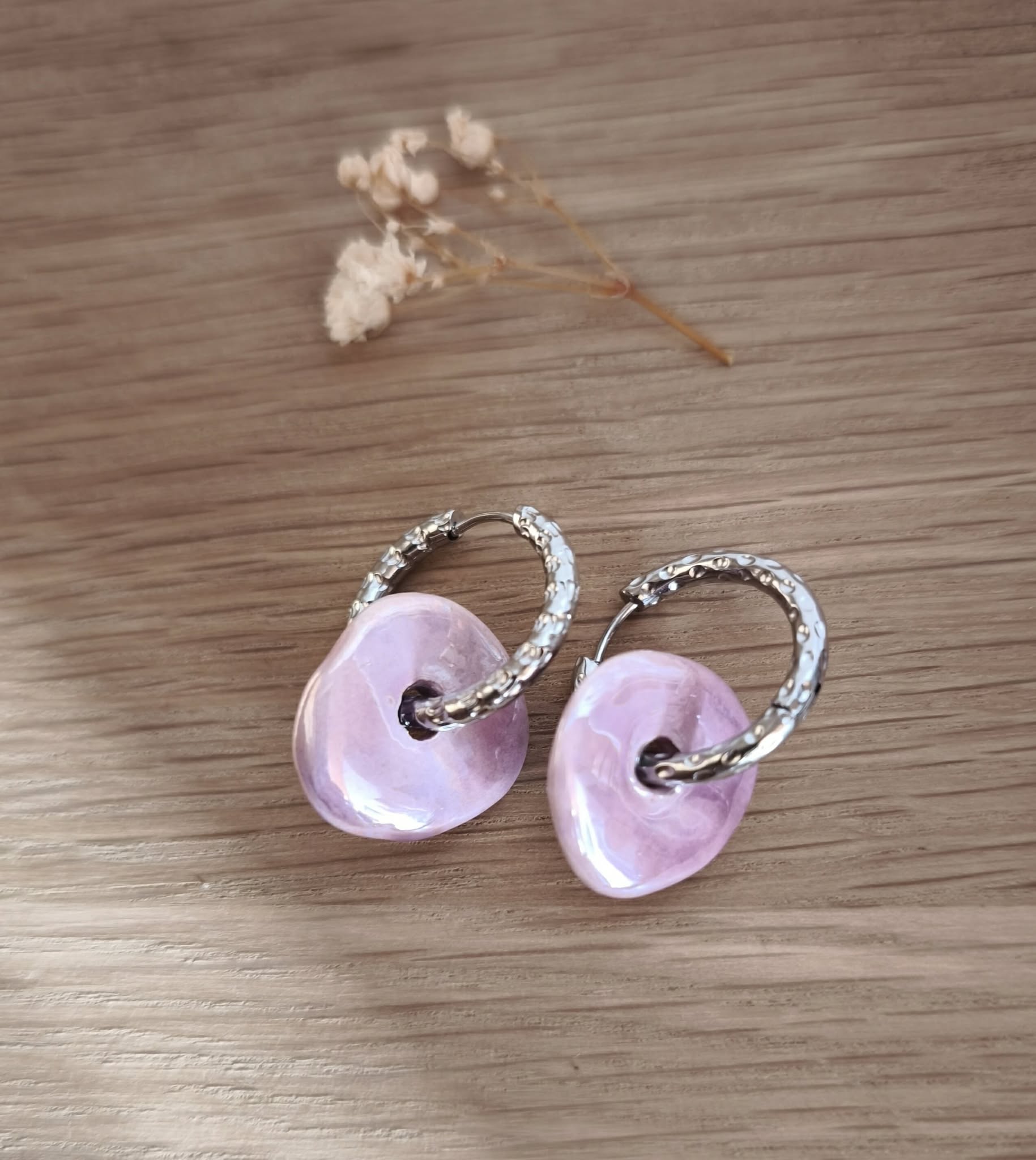 Ces boucles Lila sont composées de créoles martelées en acier inoxydable épais de diamètre de 2 cm associées à des rondelles couleur lilas en céramique. Les rondelles en céramique sont irrégulières et faites à la main en Grèce. Elles sont très légères.