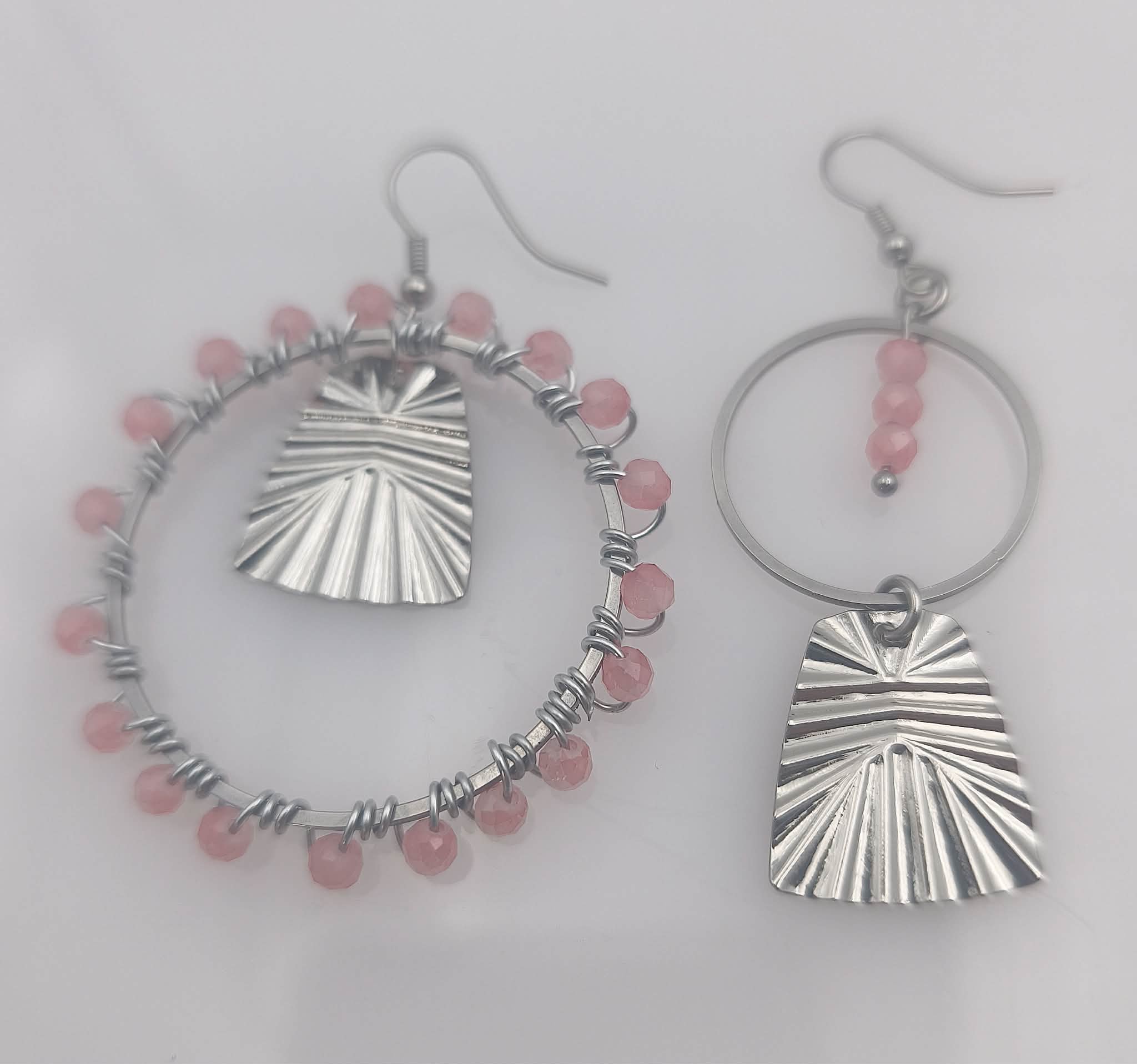 Les boucles asymétriques Maggie sont composées d’anneaux argentées en acier inoxydable de taille différente, de perles de verre couleur corail de 4 mm de diamètre et de losanges en acier inoxydable argentés striés.