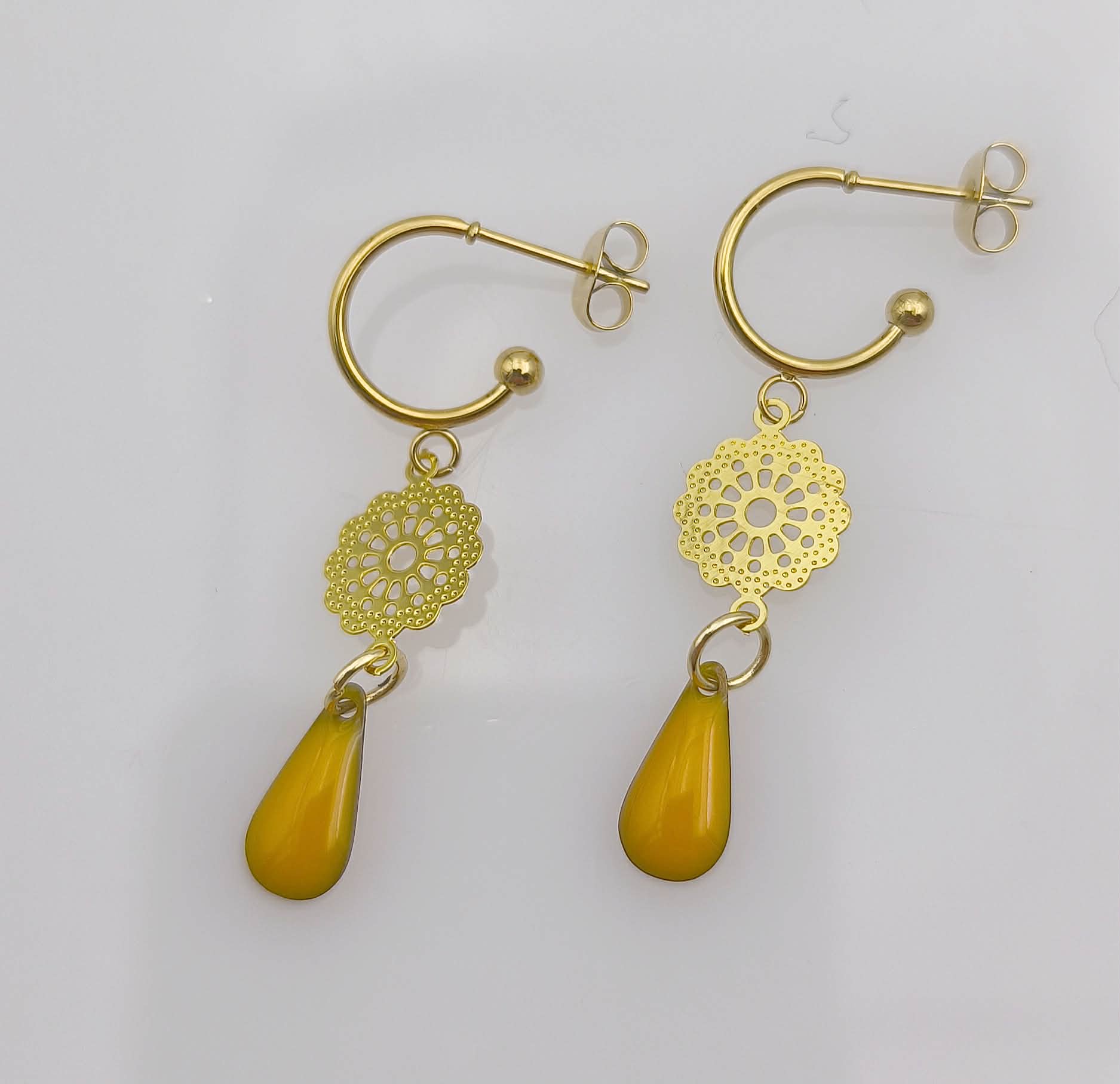 Regardez l’originalité de ces Créoles clous d’oreilles Moutarde composées de gouttes émaillées couleur moutarde et de deux connecteurs rosaces en métal filigrane doré.