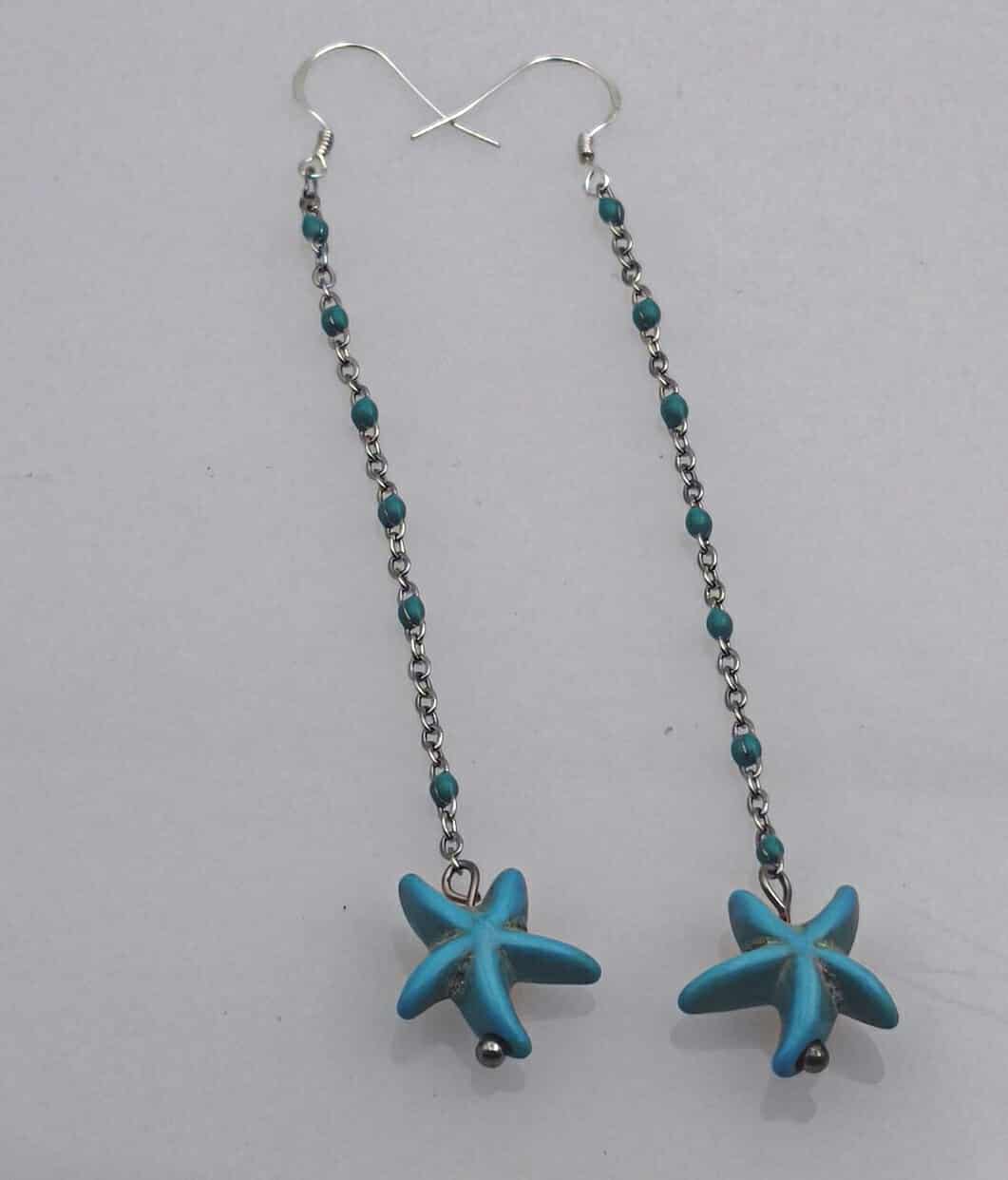Les boucles Ondine sont composées de perles en forme de d’étoile de mer turquoise en céramique accrochées sur une chaine argentée en acier inoxydable avec des petits grains en résine turquoise.