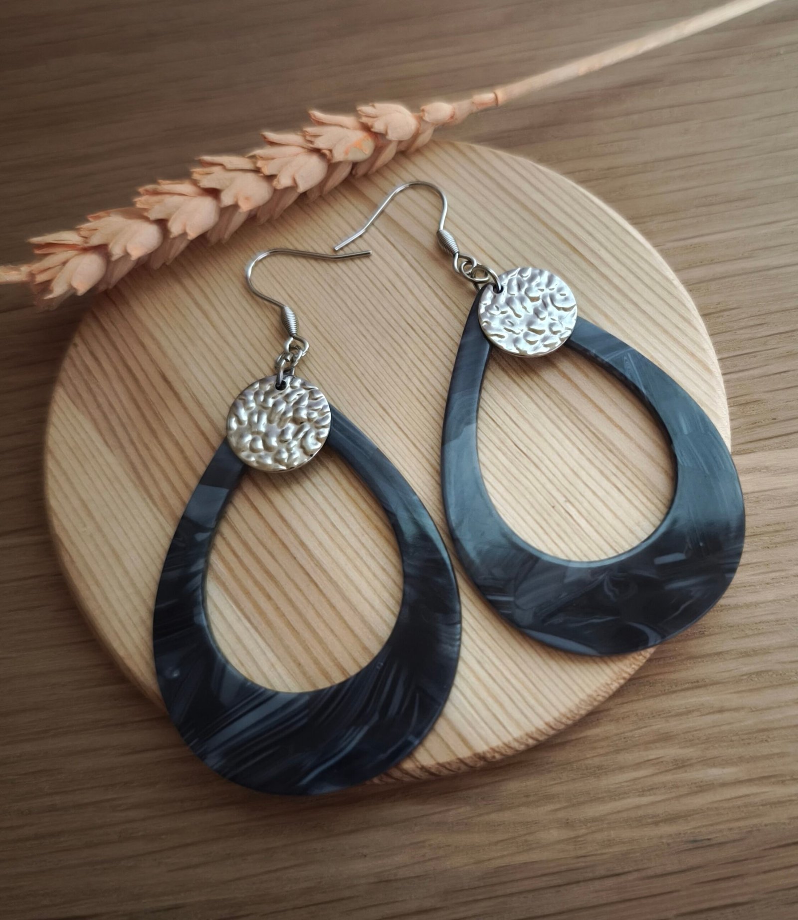 Ajoutez dès maintenant ces boucles en acrylique anthracite et métal martelé à votre collection et laissez leur charme inégalé parler pour vous.