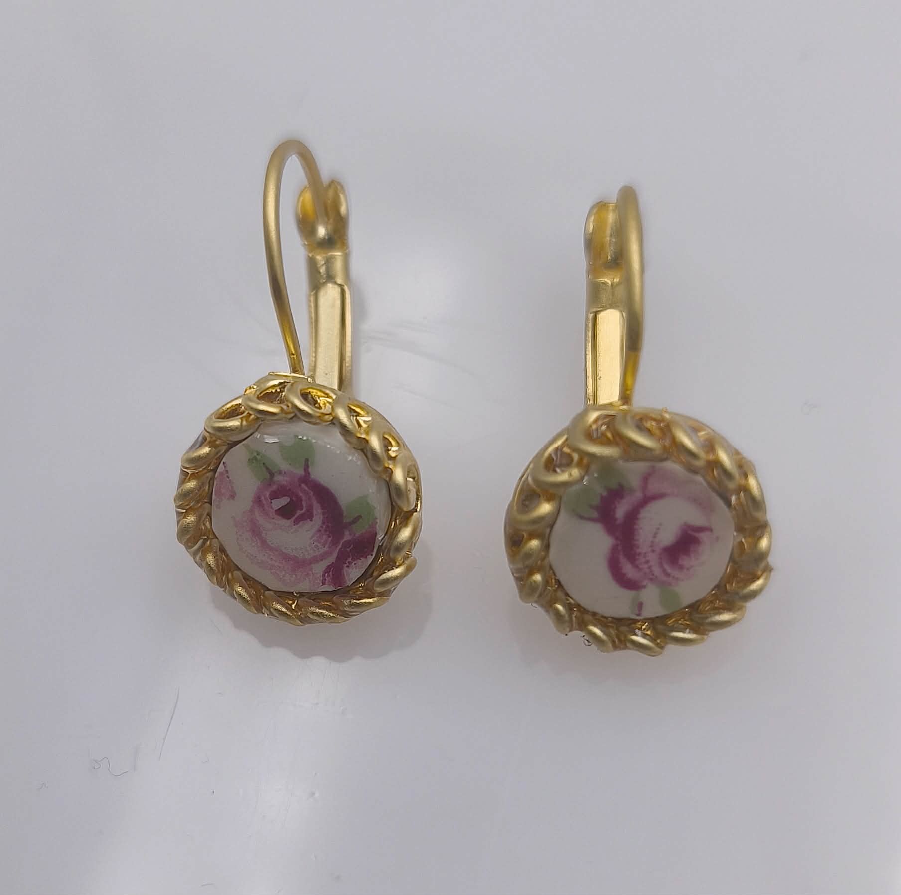 Un parfum de printemps émane de ces boucles réalisées à partir d’ une assiette ancienne en porcelaine découpée poncée pour déposer les cabochons crées de 1 cm de diamètre dans des dormeuses plaqué or .