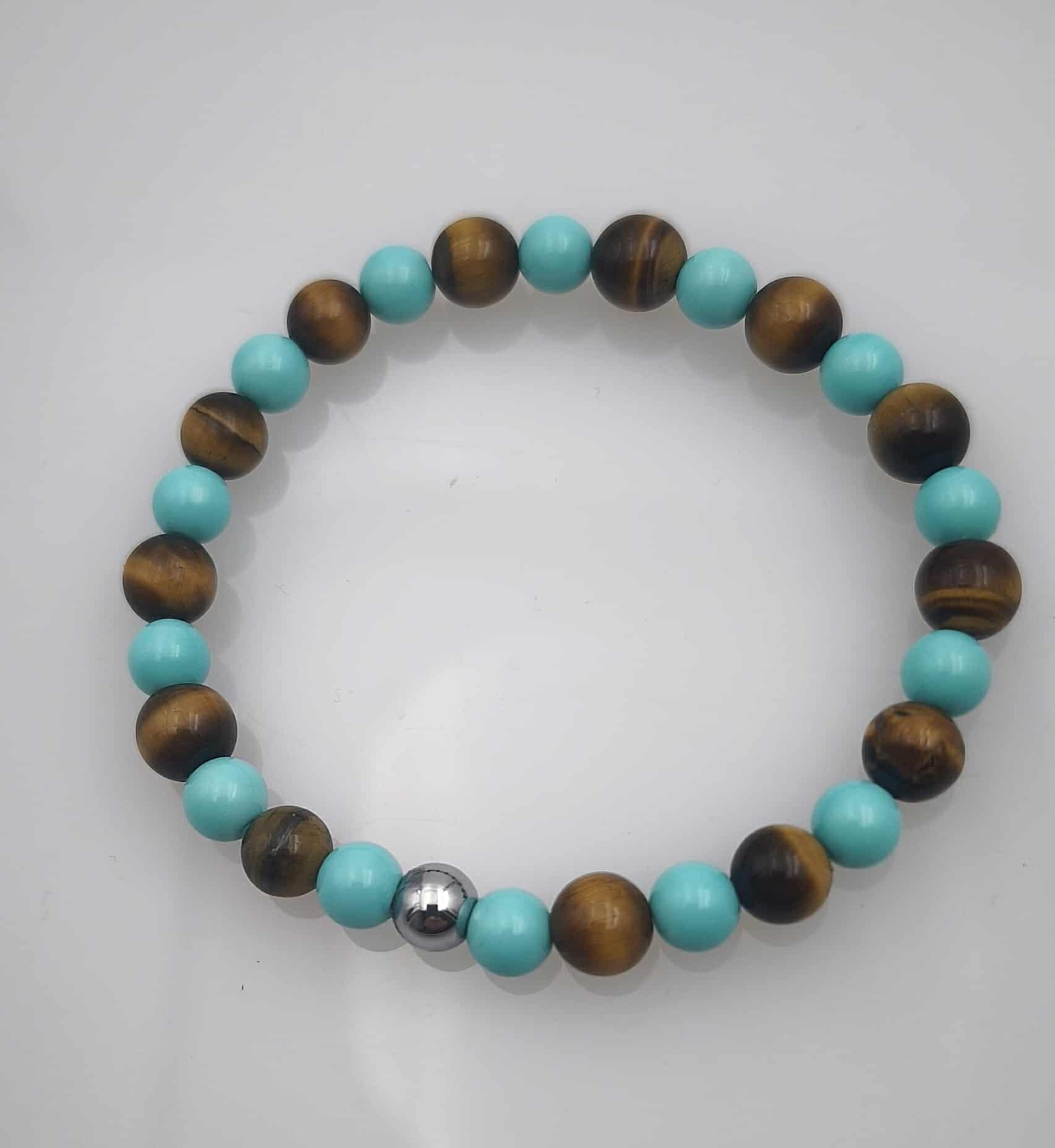 Le bracelet Adelina composé de perles rondes en pierre d’oeil de tigre et de perles en coquillage turquoise est très coloré. Sa composition et sa couleur lui donne un style élégant et gai avec une belle luminosité