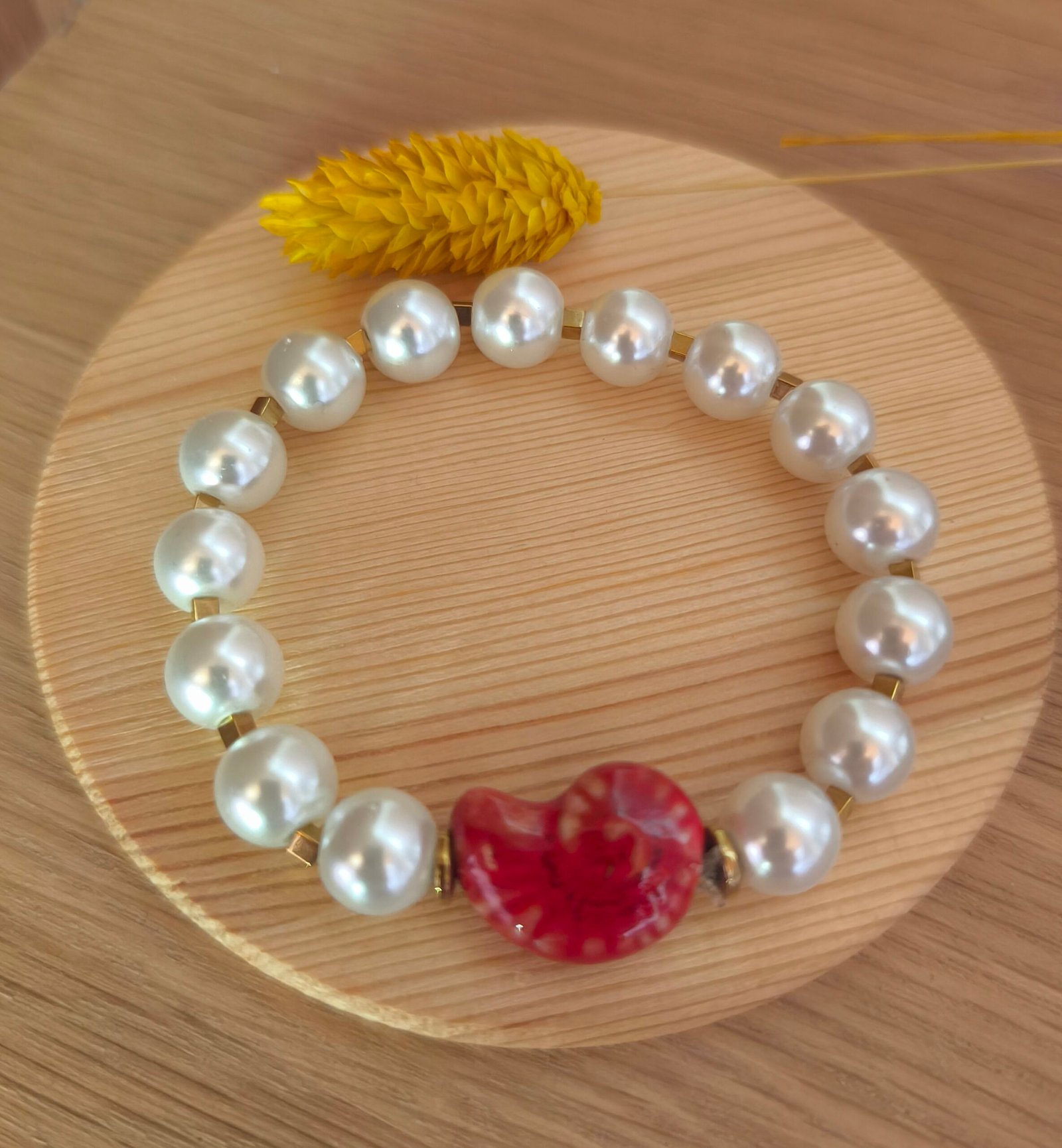 Ce bracelet extensible est bien plus qu’un simple accessoire. Il allie des perles rondes nacrées avec des carrés en hématite argentés, créant un contraste élégant et moderne. L’hématite, réputée pour sa finition argentée éclatante et sa durabilité, ajoute une dimension contemporaine au design. La perle centrale en céramique coquillage rouge apporte une touche de couleur vibrante, faisant de ce bracelet une pièce unique et créative. Chaque élément a été soigneusement choisi pour offrir à la fois esthétique et qualité.