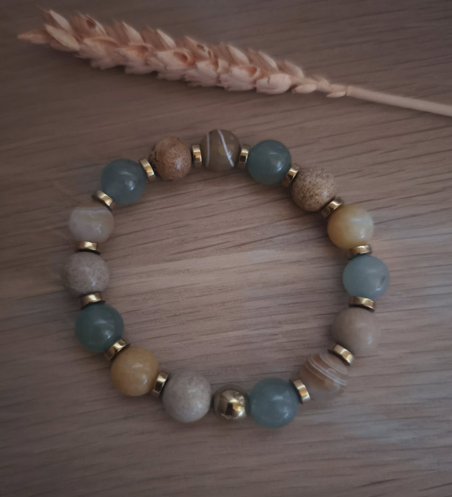 Le bracelet Annika composé de perles rondes en pierre de Agate et d’aventurine, de disques en hématite dorées. Sa composition et sa couleur lui donne un style élégant et raffiné mais les intercalaire en hématite adoré lui donne quand même une belle luminosité