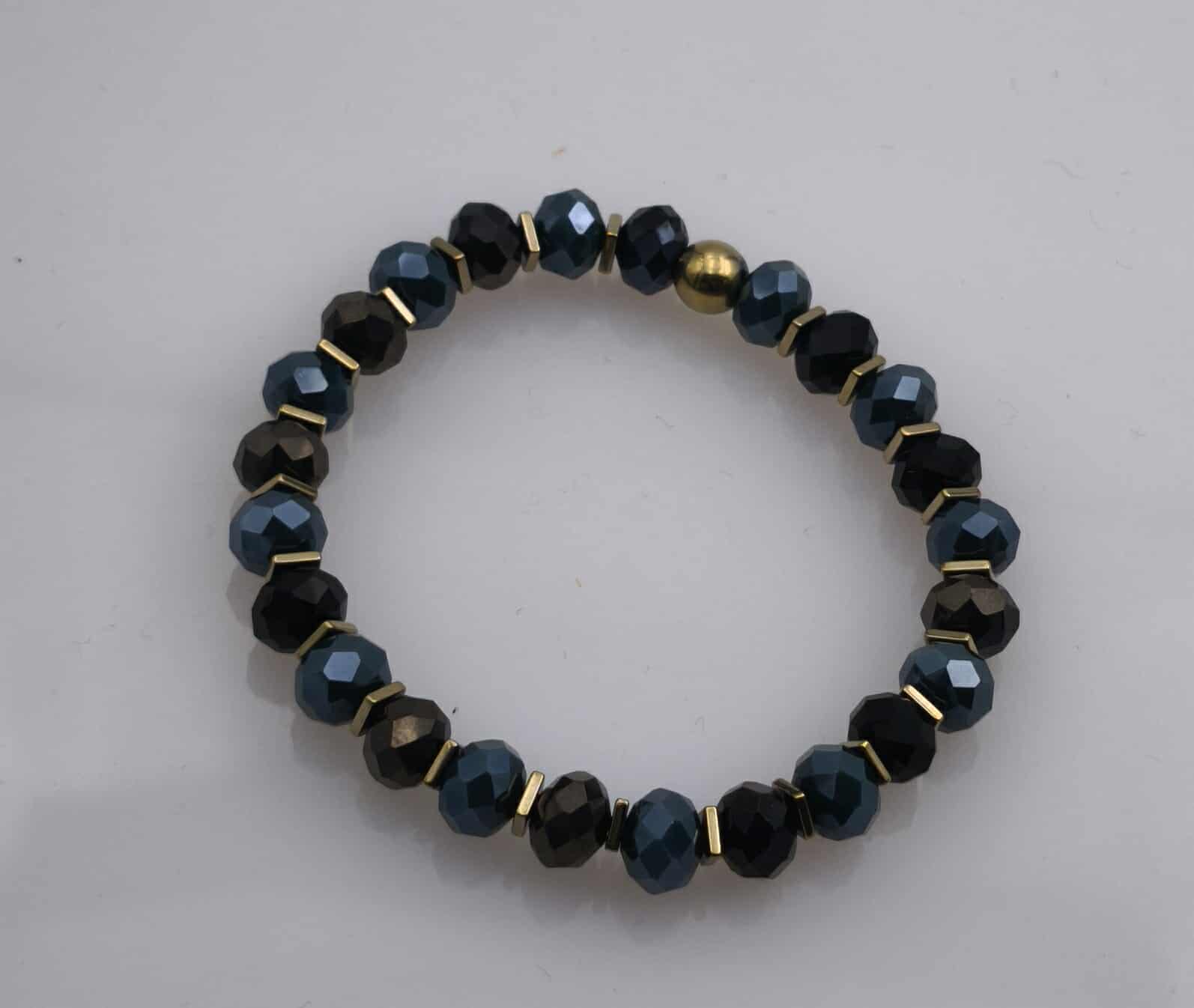 Les perles de verre sont noir anthracite et bleu pétrole et forment un élégant mariage pour ce bracelet extensible qui convient pour des poignets entre 16 et 18 cm. Une finition opacifiée apporte un peu de rusticité mais reste très élégante grâce au carrés dorés en hématite positionnés entre chaque perle.