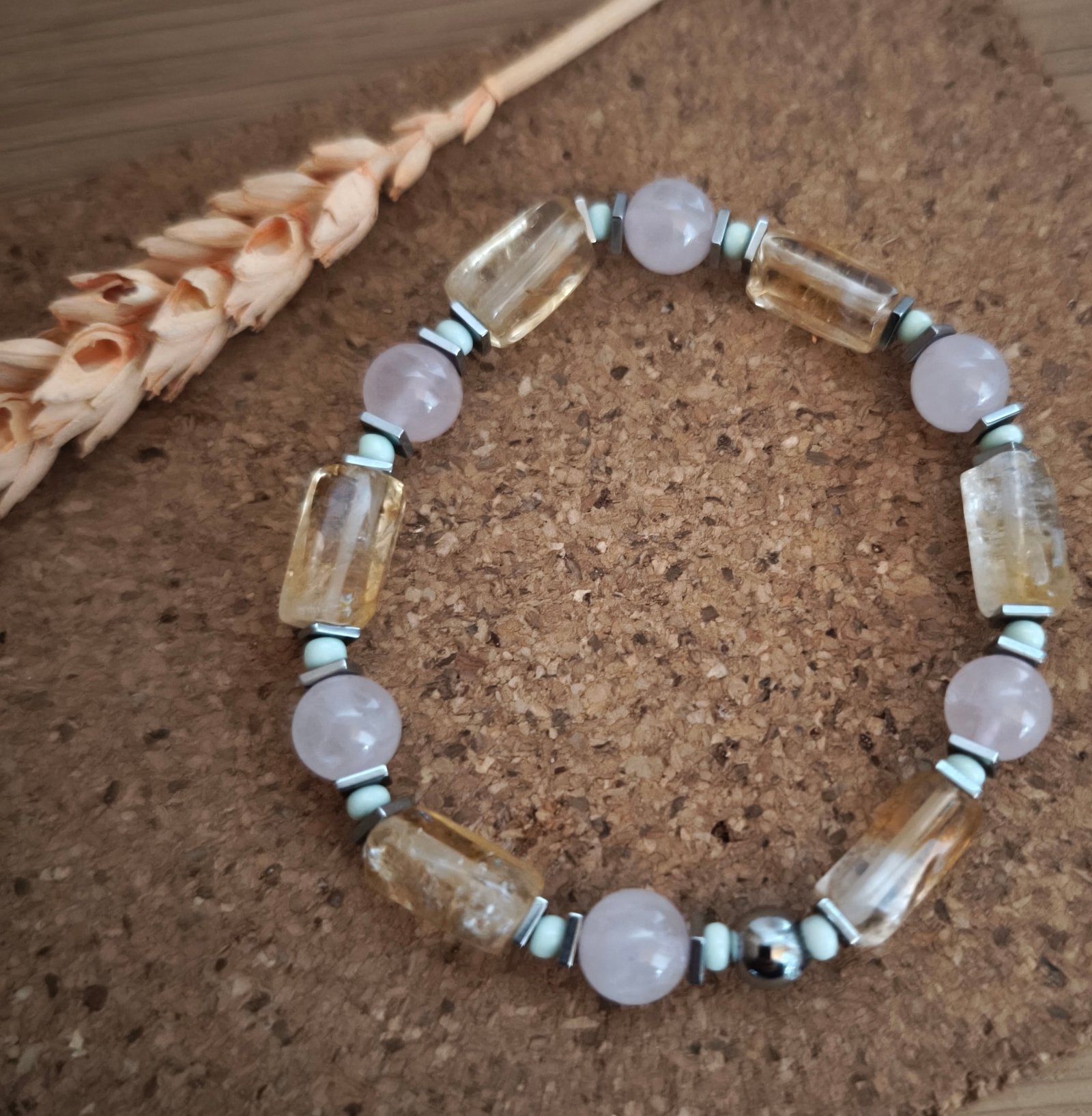 Ce bracelet se distingue par sa combinaison exquise de matériaux. En plus des perles rondes en quartz rose, il intègre des perles tubulaires en citrine, apportant une touche lumineuse et chaleureuse par leur tonalité dorée. Les intercalaires en hématite argentés ajoutent une finition sophistiquée au design, tandis que les perles de rocailles vertes apportent un contraste subtil et vibrant. Cette harmonie créée une pièce unique, idéale pour toute occasion, que ce soit une sortie décontractée ou un événement spécial.