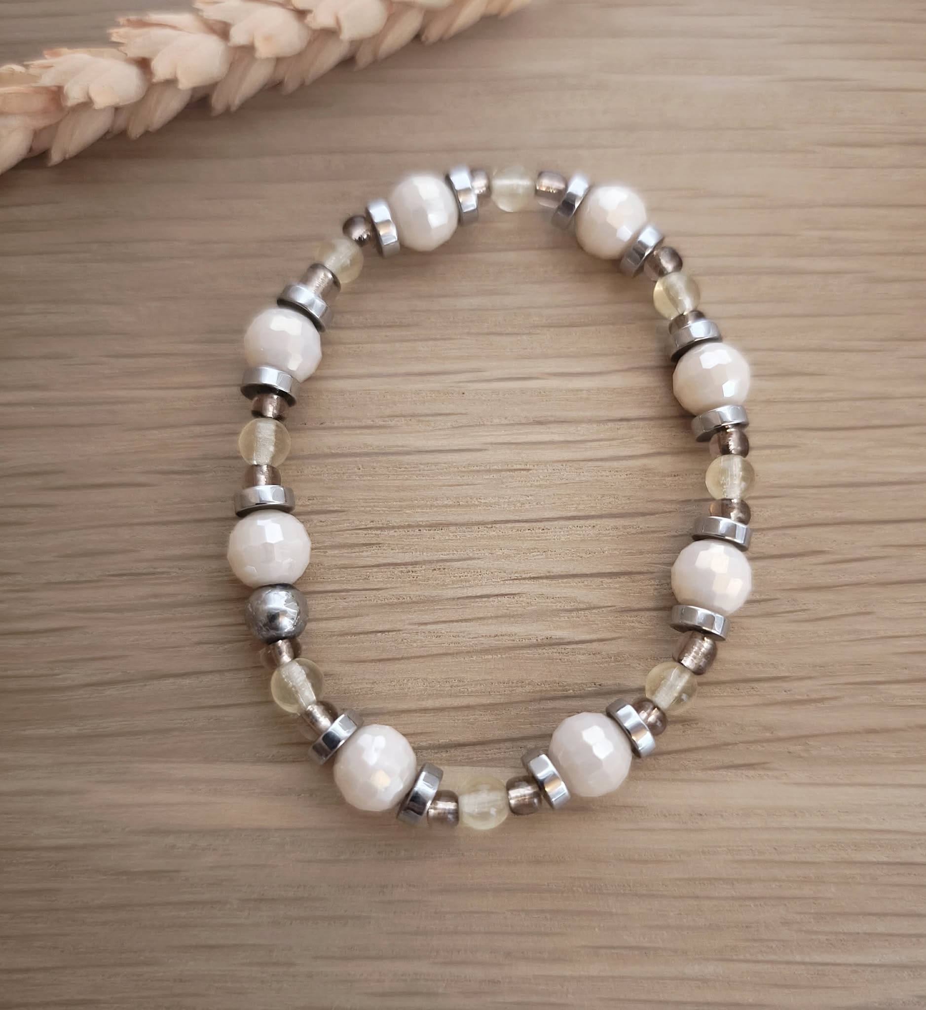 Le bracelet Eliza composé de perles rondes facettées en verre, de perles en pierre de Citrine, de disques en hématite argentée et de rocailles couleur parme. Sa composition et sa couleur lui donne un style élégant et discret mais les intercalaire en hématite argenté lui donne quand même une belle luminosité