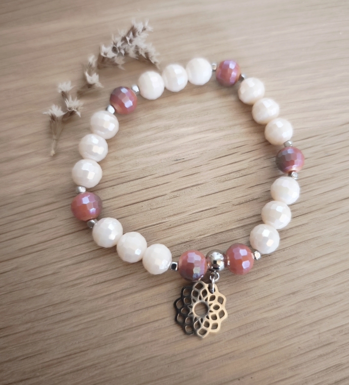 Bracelet extensible en perles de verre facettées crème et corail avec une breloque « fleur de vie » en acier inoxydable argenté.