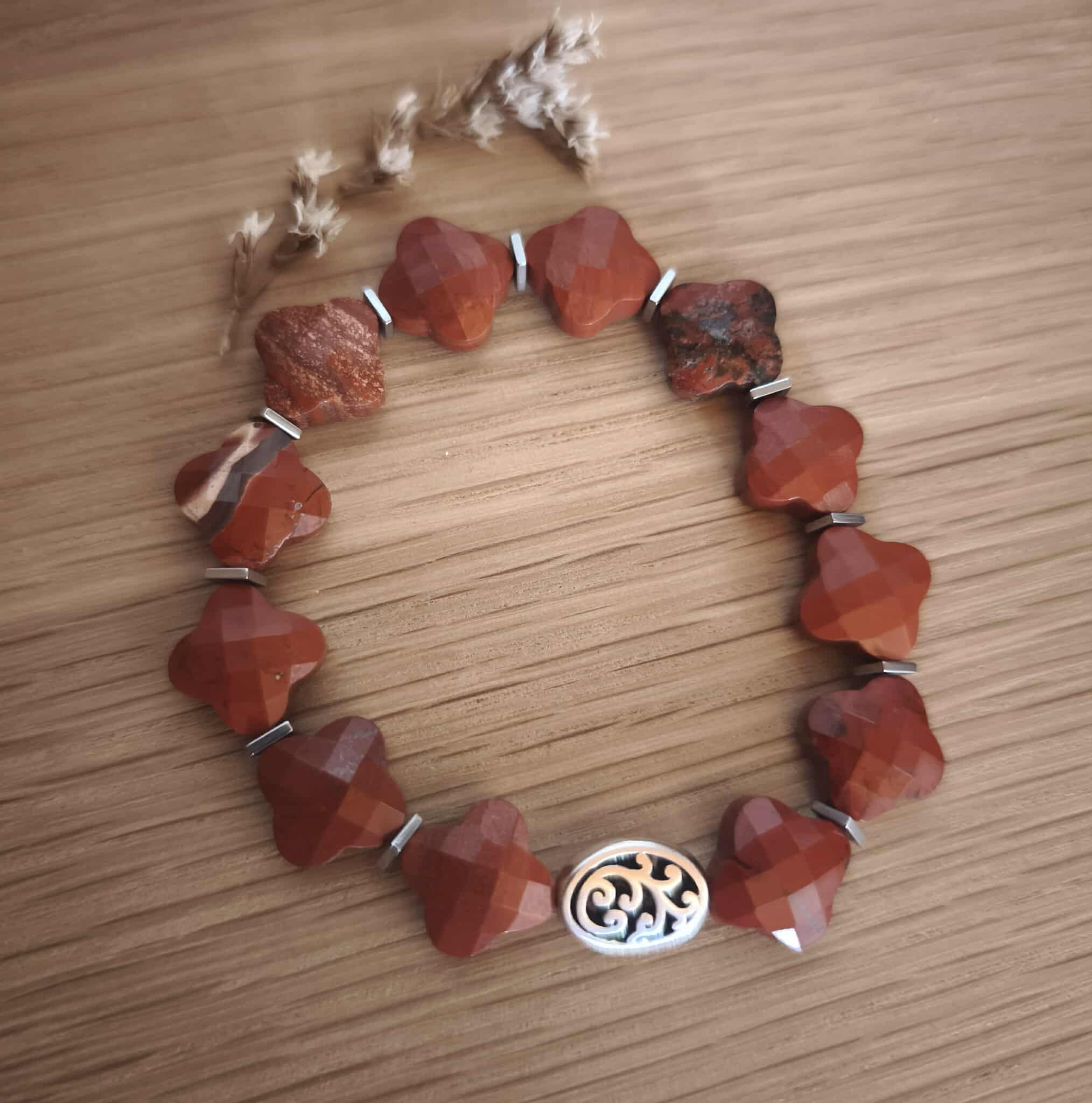 Le bracelet Jade se compose de perles en forme de trèfle à quatre feuilles en jaspe rouge de qualité supérieure ses, de carrés en hématite et terminé par une belle perle en acier inoxydable. Appréciée depuis l’antiquité, le jaspe rouge, symbole d’équilibre et de sérénité donne un effet somptueux au bracelet grâce à sa teinte rouge orangé veinée.