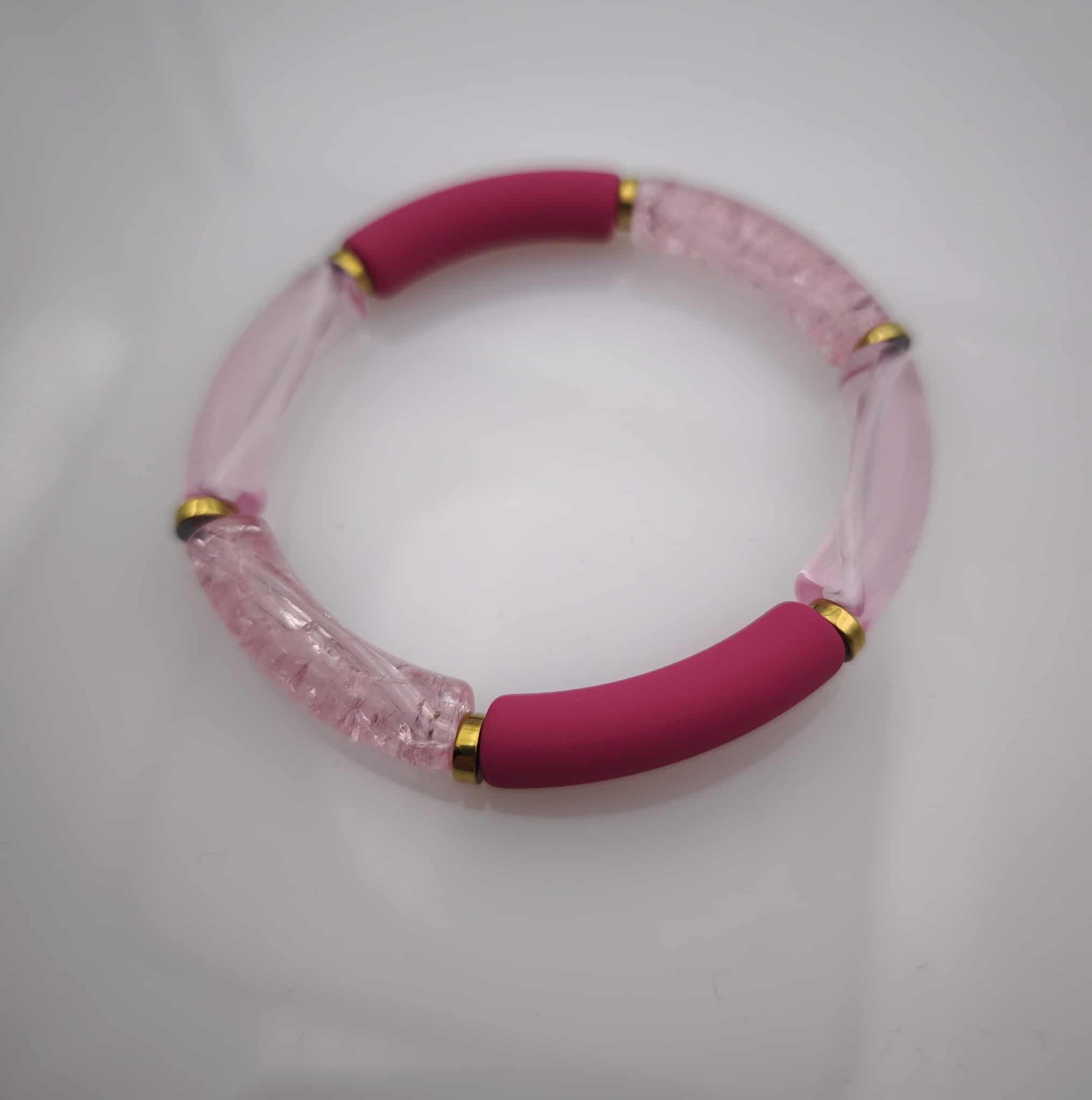 Le bracelet Livia composé de tubes acryliques courbés et de rondelles dorées en hématite épousera votre poignet avec élégance. Il est très léger et conçu pour être enfiler facilement grâce à son fil extensible.