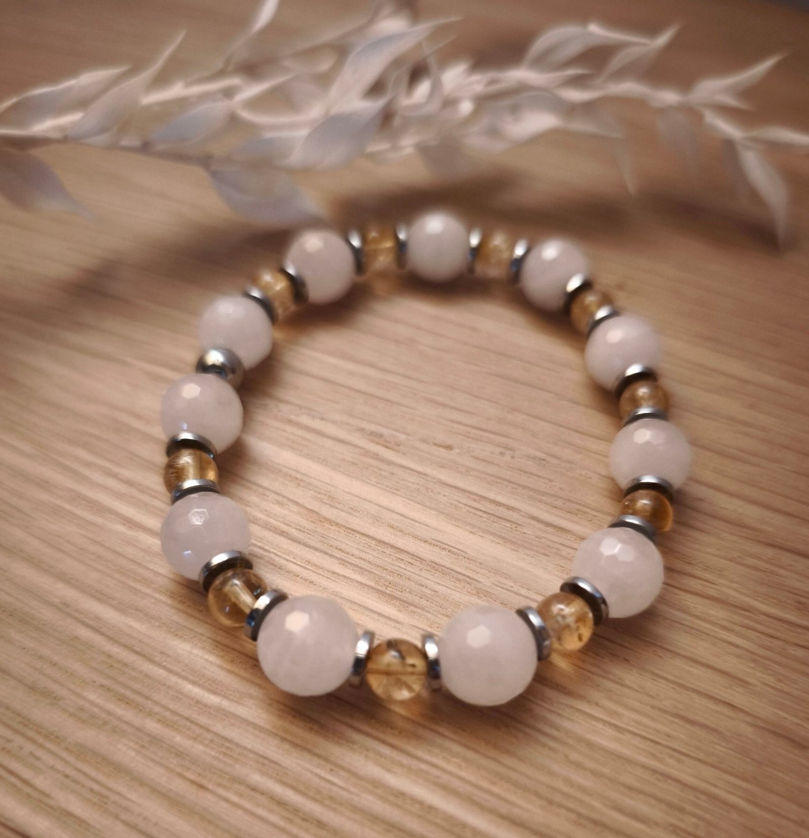 Ce bracelet extensible est soigneusement confectionné à partir de trois pierres réputées pour leurs bienfaits : Quartz Rose, Citrine, et Hématite. Le quartz rose est connu pour ses propriétés apaisantes, favorisant l’amour de soi et la sérénité. La citrine, souvent surnommée la « pierre du succès », invite l’énergie positive et renforce la confiance en soi. Les rondelles d’hématite apportent un équilibre émotionnel tout en favorisant l’ancrage et la stabilité. Cette combinaison harmonieuse crée un bijou teinté de beauté et de sens profond.