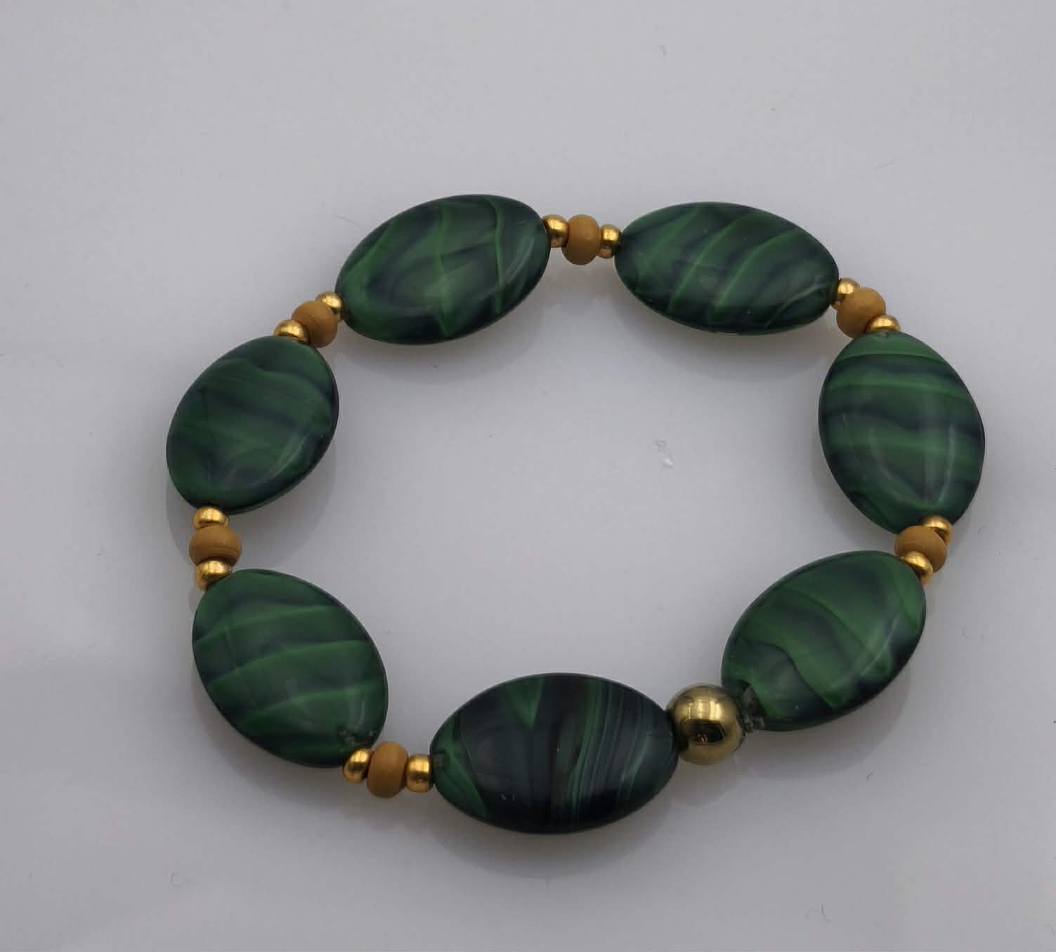 Laissez vous tenter par ce bracelet composé de perles en forme de palet vert sapin récupérés sur un collier chiné chez Emmaüs. Ces perles originales en verre avec un motif de vague donnent une âme à ce bracelet. Je les ai associées à des perles en bois et à des rocailles dorées. Ce bracelet est extensible et convient au plus grand nombre.