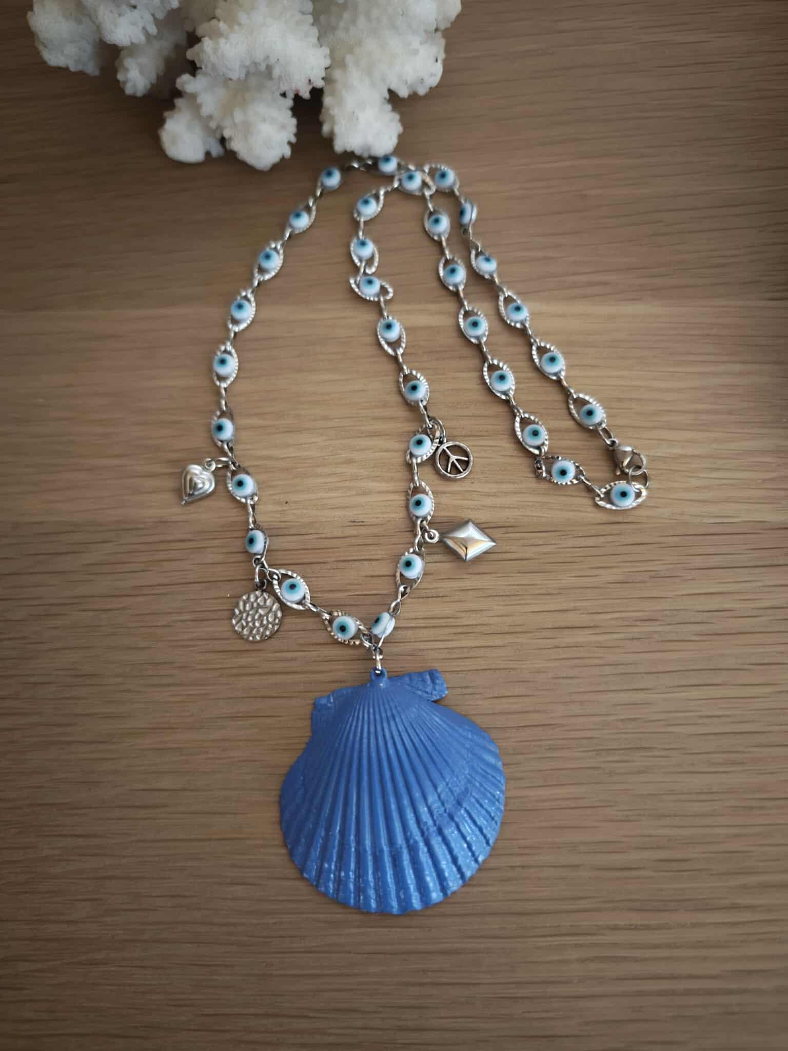 Ce collier ne se contente pas d’être élégant, il raconte une histoire. Les breloques variées comprennent un coquillage peint rappelant la mer et l’exotisme, un losange qui symbolise l’équilibre, un cœur pour l’amour, une pastille martelée qui met en avant un style artisanal, et le symbole universel de la paix gravé dans l’acier. Chacune de ces breloques est soigneusement sélectionnée pour créer une harmonie visuelle et transmettre des messages et sentiments positifs.