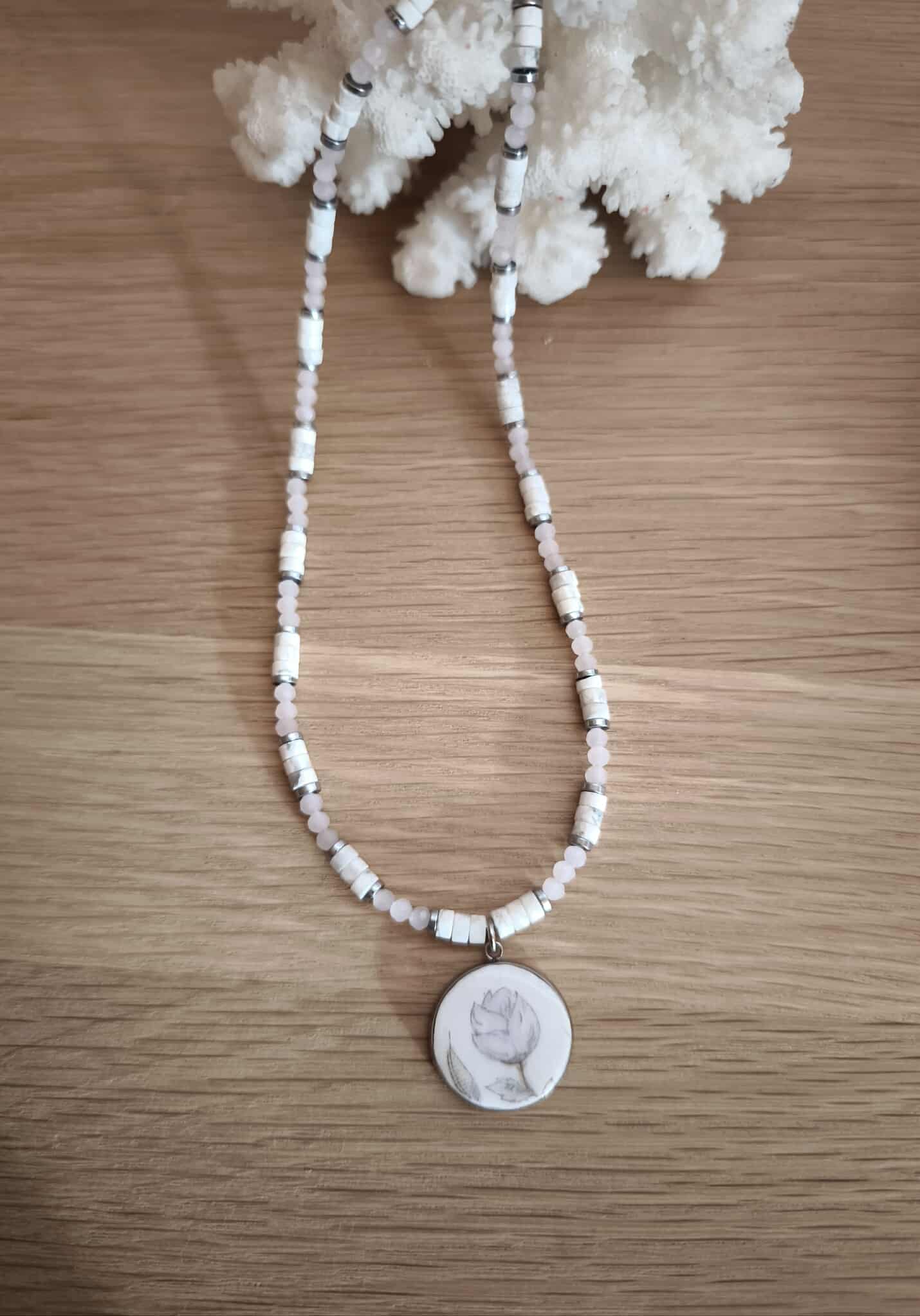 Le véritable point fort de ce collier est son pendentif unique en forme de bouton de rose. Réalisé en porcelaine ancienne dans mon atelier, il témoigne d’un savoir-faire artisanal exceptionnel. Avec un diamètre de 20 mm, ce pendentif ajoute une touche délicate et poétique à l’ensemble du bijou, en faisant une pièce distincte et mémorable pour votre collection d’accessoires. La howlite blanche est une pierre calmante qui correspond aux personnes timides étions besoin de stabilité émotionnelle. Elle est très connue pour ses vertus et bienfaits notamment sur la beauté de la peau ou encore des cheveux.