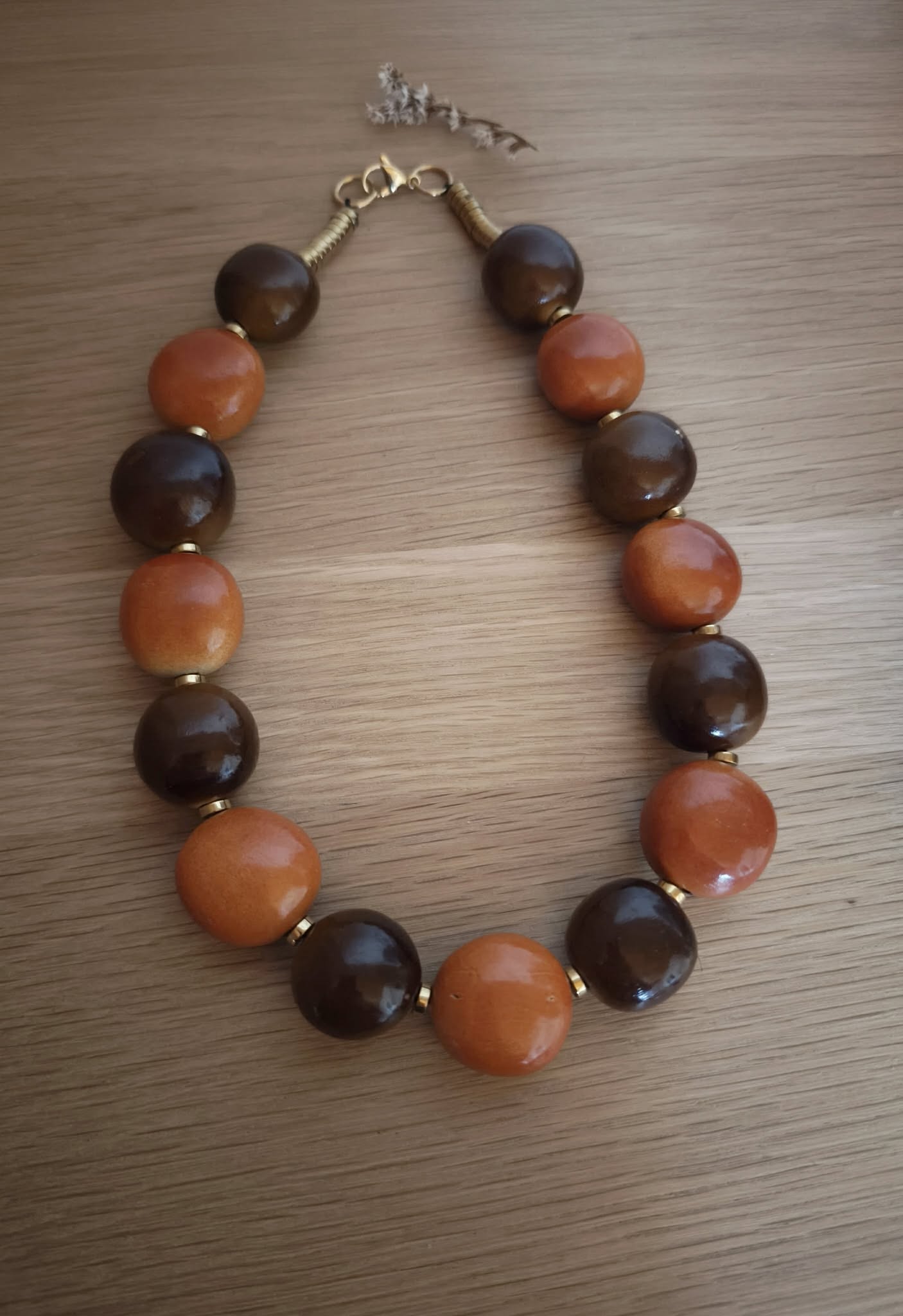 Le collier Frida est composé de graines marron et caramel récupérées sur un ancien collier ramené certainement d’un voyage que j’ai reçu en donation. Ces graines d’origine tropicale proviennent de lianes puissantes, elles sont creuses et sont percées pour en faire des perles originales qui sont mises en valeur dans ce collier par des intercalaires dorées en hématites.