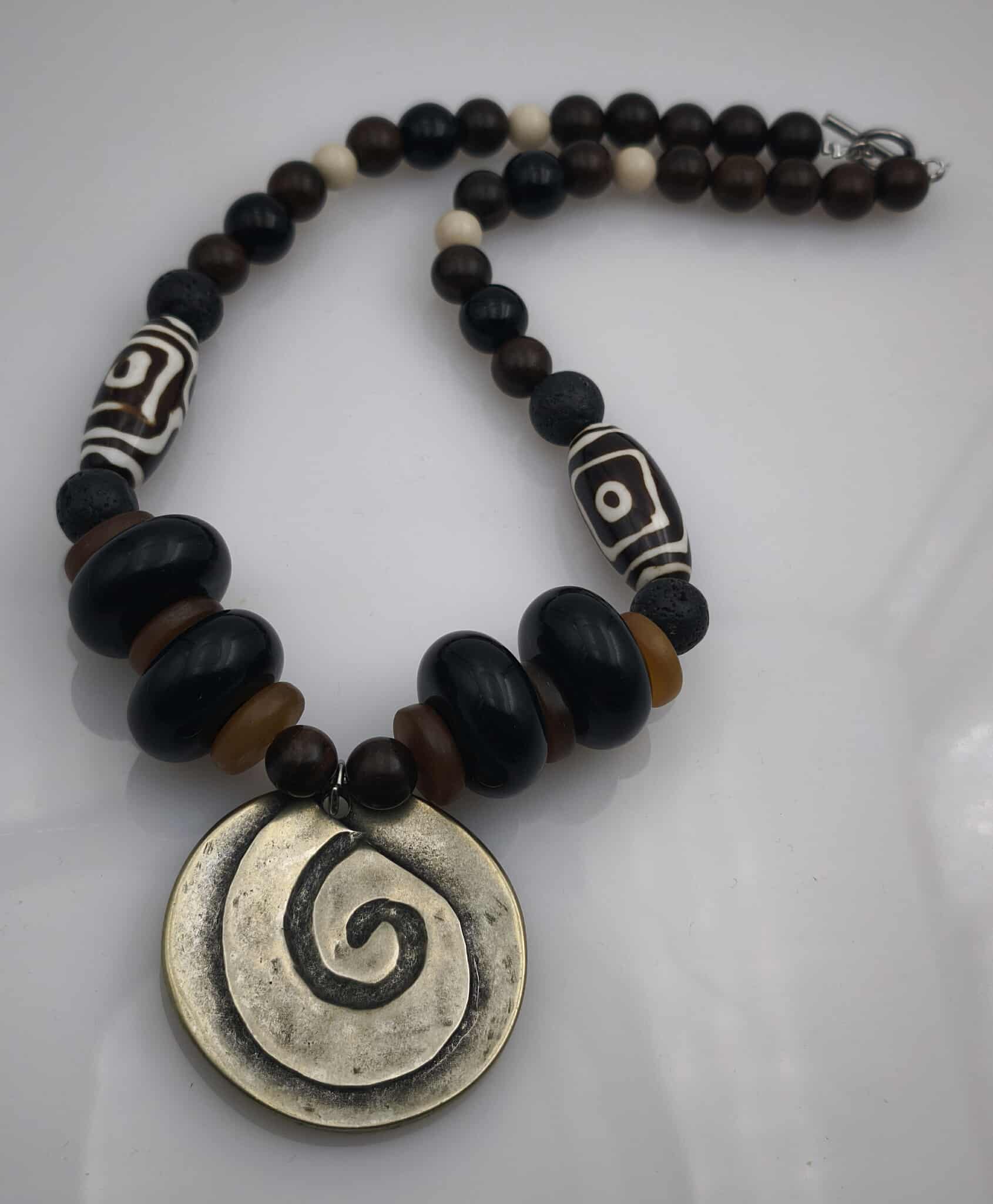 De couleur marron, beige et,caramel, les perles en bois, en pierres de rivière, en pierres de lave ou en agate tibétain donne un beau caractère à ce collier.