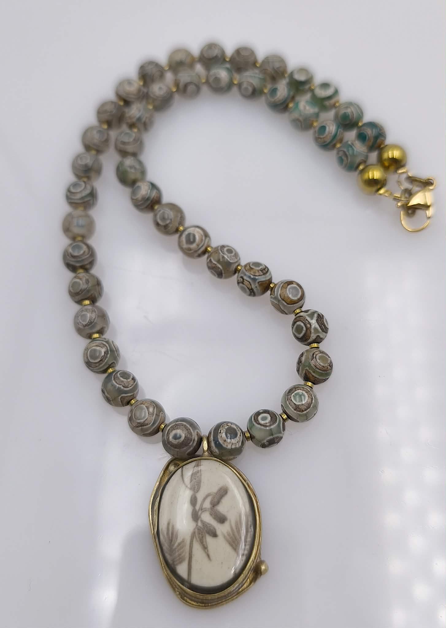 Ce collier River Jungle est composé d’un pendentif en métal plaqué or dans lequel est enchâssé un médaillon en porcelaine fabriqué dans mon atelier à partir d’une assiette ancienne et d’un tour de cou en Agate d’Afrique « Jungle » de 8 mm de diamètre et de rondelles dorées en hématite.