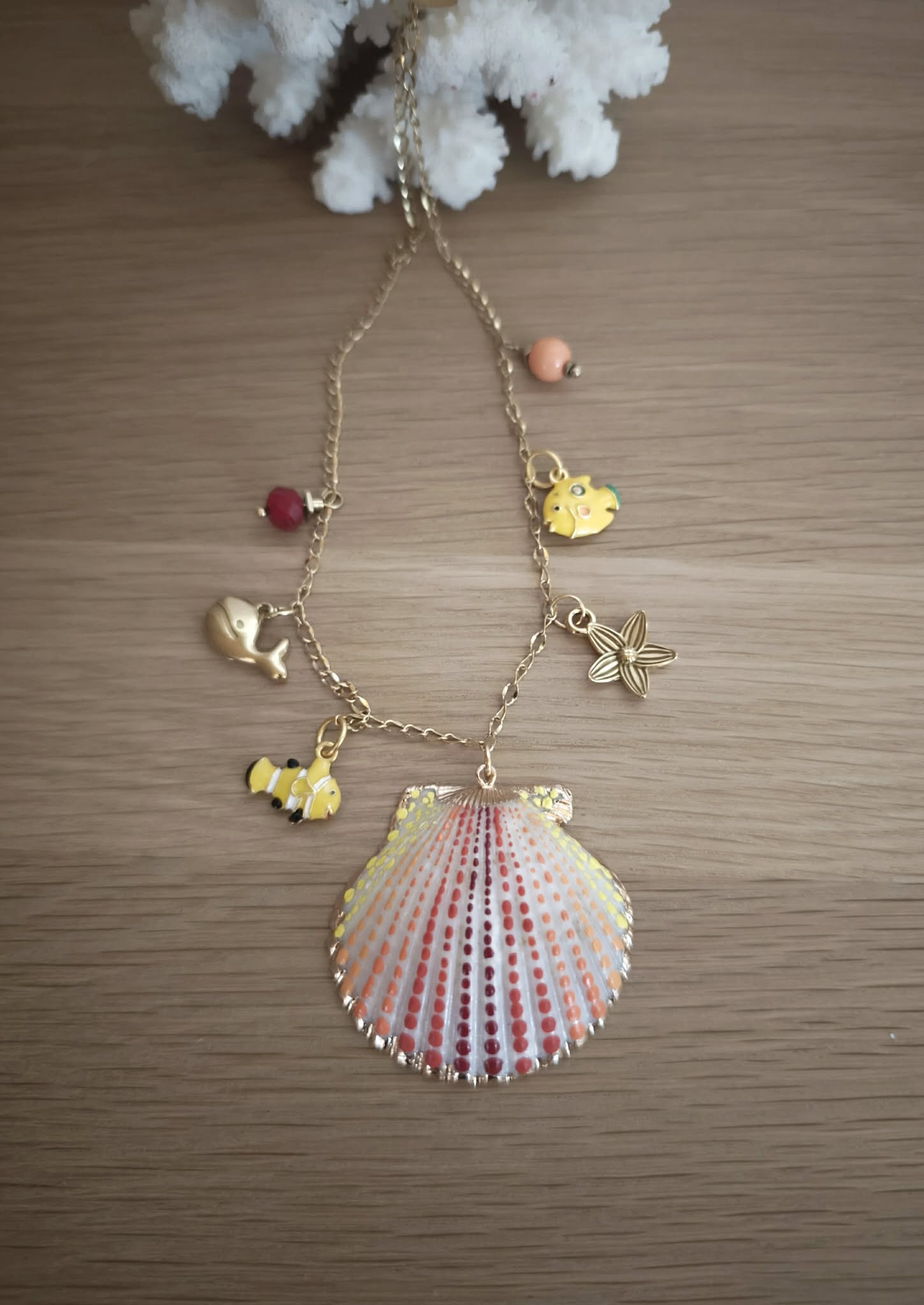 Ce collier met en lumière la richesse et la diversité des trésors sous-marins. Il arbore sept breloques inspirées par la mer : un adorable coquillage, une baleine élégante, une fleur aquatique, des poissons et plus encore. Ces détails subtils ajoutent une touche de fantaisie à votre tenue tout en vous connectant à la sérénité des océans.