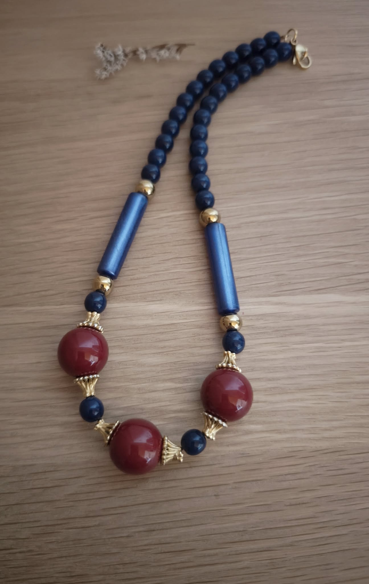 Créé à partir d’un démontage d’un collier ancien en récupérant les perles bleu azur, les deux tubes et les coupelles ou calottes dorées, cet élégant ras de cou que j’ai appelé Azalée vous racontera son histoire.  Lumineux et très tendance avec ces trois grosses perles rouge grenat en acrylique qui mettent en valeur les perles bleues, il sera vous charmer.