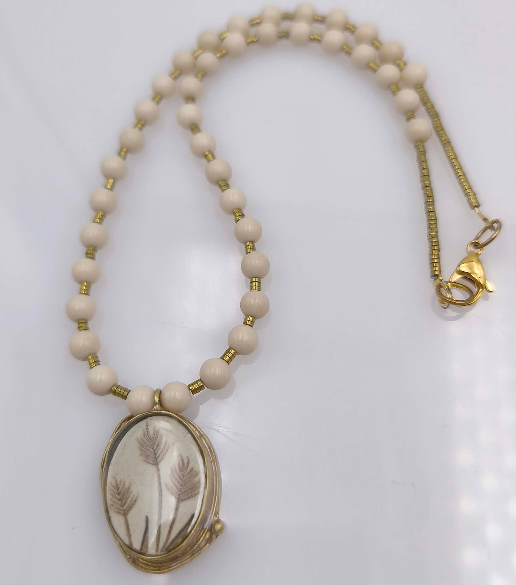 Ce collier River Stone est composé d’un pendentif en métal plaqué or dans lequel est enchâssé un médaillon en porcelaine fabriqué dans mon atelier à partir d’une assiette ancienne et d’un tour de cou en pierre de rivière de 6 mm de diamètre et de rondelles dorées en hématite.
