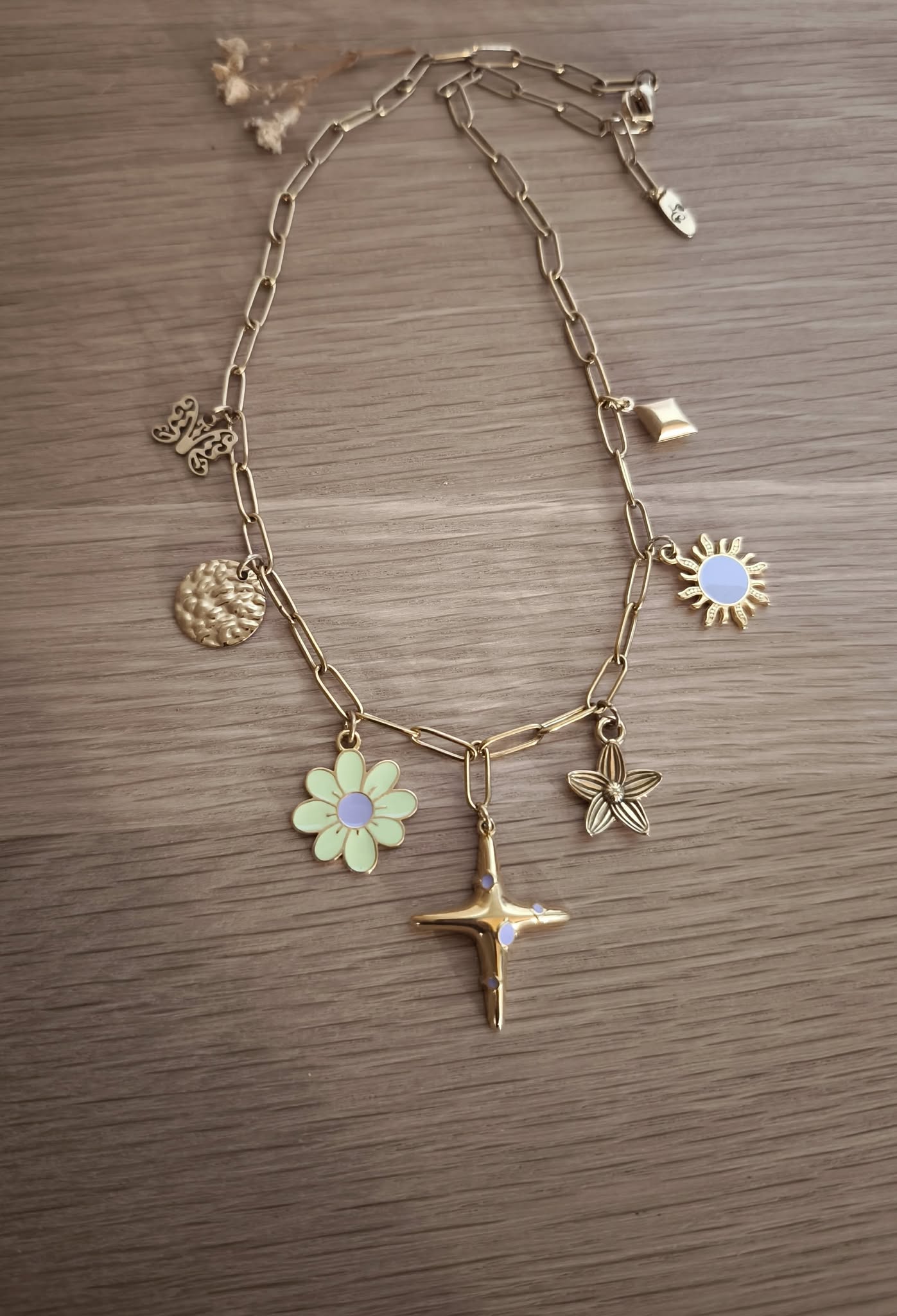 Le collier Luna est pensé et assemblé dans mon atelier. Il est composé d’une chaine dorée en acier inoxydable à maillons allongés sur laquelle sont fixées 7 charm’s : étoile, fleurs, soleil, papillon, losange, disque martelé. Ce collier est ajustable car le mousqueton peut s’accrocher le long de la chaine.