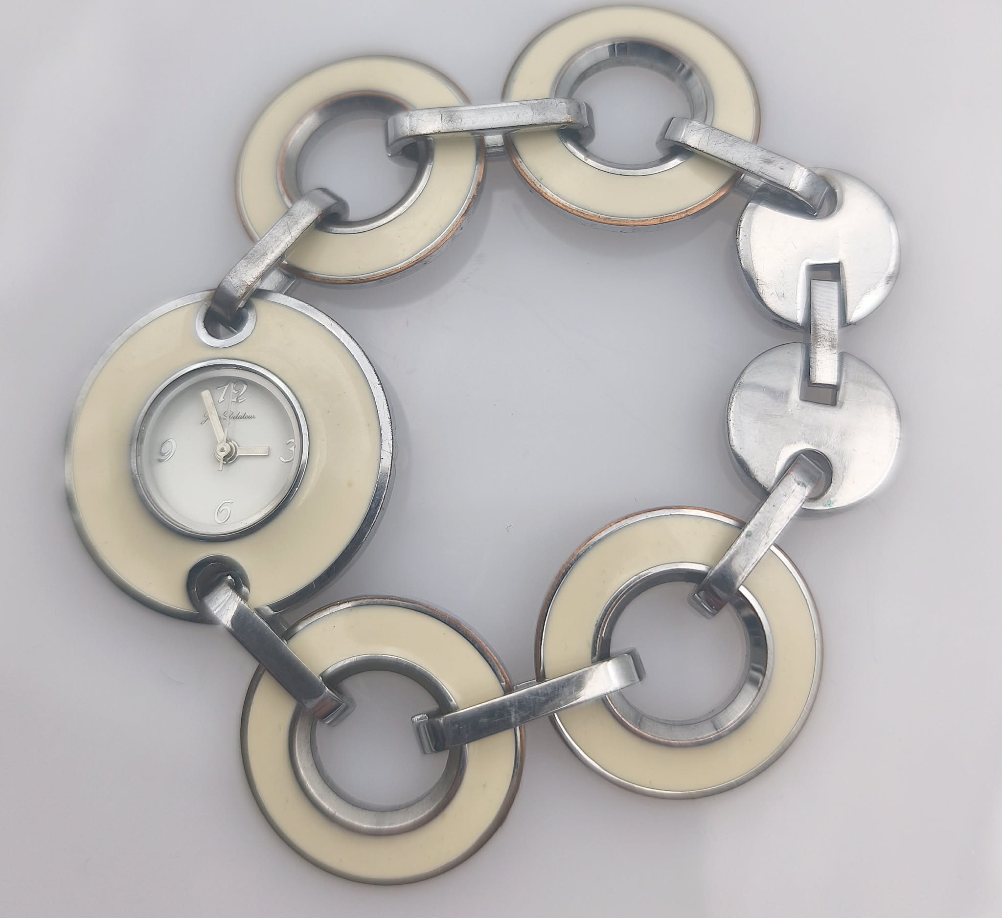 Adoptez cette montre qui est aussi un bijou comme un bracelet original émaillé couleur coquille d’œuf avec ses cercles.