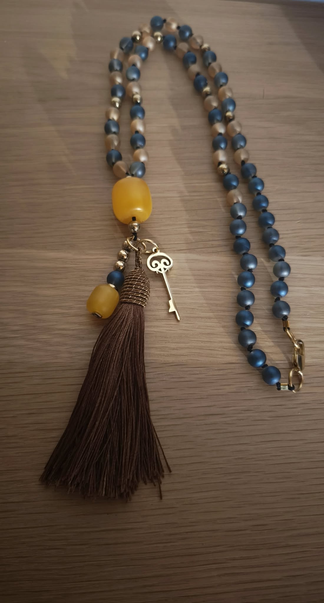 Ce sautoir composé de perles en perle de verre rondes opaques dans les tons bleu foncé et miel. De la profondeur avec des perles organiques couleur miel en corne apportent une belle élégance. Un beau pompon en fils de soie marron (10 cm de longueur), une breloque clef, des perles terminent avec élégance ce sautoir.